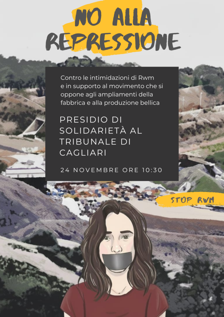 Stop Rwm, A Foras – Contra a s’ocupatzione militare de sa Sardigna, Assemblea permanente Villacidro, Assotziu Consumadoris de Sardigna, Cobas Cagliari, Collettivo Malarittas, Comitato Riconversione RWM, Confederazione Sindacale sarda – CSS, Gmtg-Oristano, Italia Nostra Sardegna, Movimento Nonviolento Sardegna, PCI Federazione Sulcis Iglesiente, Potere al Popolo Sardegna, Rete Warfree – Cittadine e cittadini per un mondo libero dalla guerra, Scuola Civica di Politica – La Città in Comune, Social Forum Cagliari, Su Entu Nostru, USB – Unione Sindacale di Base/Confederale Sardegna, Madri contro l’operazione lince – contro la repressione.